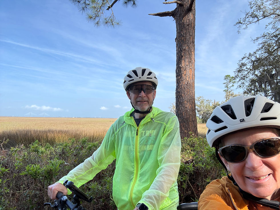 March 31, 2026 - We decided to come to Jekyll Island because we’d heard it had great bilking trails. We were not disappointed! We headed out after breakfast toward the historic district. The paved, well maintained trail took us through stands of huge old live oaks. Spanish moss decorated the sprawling branches. We passed coastal flats and rode among palms and pines. It passes the ruins of early settlers homes and plantations.